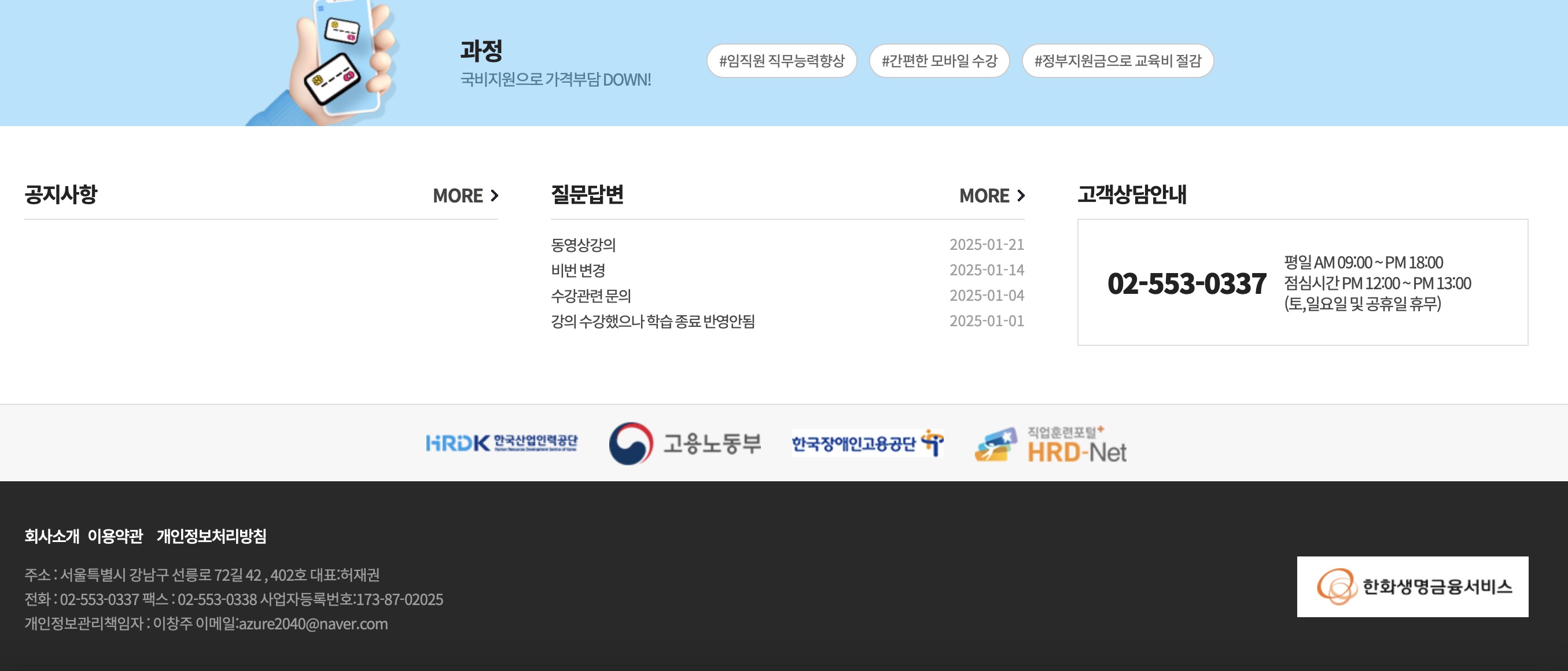 한화생명금융서비스 고객응대업무종사자교육(hw.h-edu.co.kr)은 한화라이프랩이 제공하는 기업 맞춤형 온라인 학습 플랫폼으로, 금융서비스 종사자들의 전문성을 높이고 고객 응대 능력을 강화하는 데 중점을 두고 있습니다. 이 교육 플랫폼은 법정 필수 교육과 다양한 직무 교육 과정을 통해 종사자들이 최신 지식과 기술을 습득할 수 있도록 지원합니다.