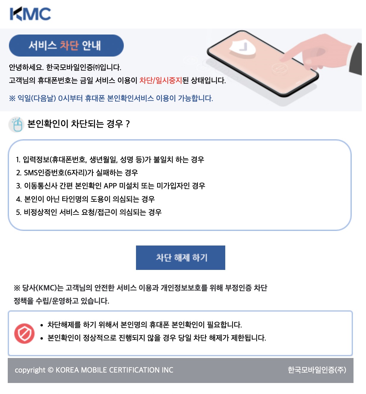 한국모바일인증㈜에서 제공하는 본인확인 즉시차단해제 서비스는 고객의 휴대폰 번호가 차단되거나 일시 중지된 상태에서 이를 해제하기 위한 절차를 안내합니다.  차단 해제 안내접속 주소: 본인확인 즉시차단해제 페이지차단/중지 사유: 고객님의 휴대폰 번호는 서비스 이용이 금일 차단되거나 일시 중지된 상태입니다.차단 해제 시점: 익일 0시부터 본인확인서비스가 자동으로 해제되어 다시 이용이 가능합니다. 즉시 차단 해제 방법웹사이트 접속: 본인확인 즉시차단해제 안내에 접속합니다.본인 인증: 차단 해제를 위해 본인 확인 절차를 진행합니다.차단 해제 완료: 인증 후, 즉시 차단 해제 처리가 완료되면 본인확인서비스를 정상적으로 이용할 수 있습니다.  주의사항자동 해제: 차단된 휴대폰 번호는 익일 0시부터 자동으로 해제되며,..